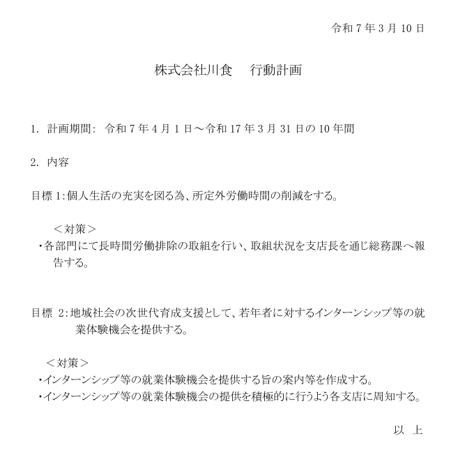 (平成27年10月10日 (食彩館) 店舗改装開店)昭和32年 5月 赤澤商店発足 (食料品卸問屋) 昭和39年10月31日 川崎食料品有限会社 設立 平成22年 4月 9日 スーパー川食(食彩館)すずかけ店 開店 (支店一号店) 昭和57年 7月 8日 スーパー川食川崎店 開店 (支店二号店) (平成20年 5月30日 (食彩館) 店舗改装開店) 昭和61年 9月 本社社屋現在地へ移転 平成 1年10月20日 スーパー川食吉富店 開店 (支店三号店) (平成13年 3月 1日 (食彩館) 店舗改装開店) (平成28年 4月27日 (食彩館) 店舗改装開店) 平成 5年 3月11日 スーパー川食鯰田店 開店 (支店四号店) (平成29年 7月19日(移転) 店舗改装開店) 平成 5年 9月16日 スーパー川食碓井店 開店 (支店五号店) (平成19年12月 5日 (食彩館) 店舗改装開店) 平成 6年 3月16日 赤澤 信生 創業社長死亡 平成 6年 5月25日 株式会社 川食 に社名変更 平成 8年 4月26日 スーパー川食志井店 開店 (支店六号店) (平成27年11月24日 (食彩館) 店舗改装開店) 平成 8年11月15日 スーパー川食添田店 開店 (支店七号店) (平成18年 7月13日 (食彩館) 店舗改装開店) 平成10年 6月19日 スーパー川食(食彩館)庄内店 開店 (支店八号店) (平成27年 6月 9日 (食彩館) 店舗改装開店) 平成10年10月 9日 スーパー川食(食彩館)赤池店 開店 (支店九号店) (平成29年 5月18日 (食彩館) 店舗改装開店) 平成12年 2月 9日 スーパー川食(食彩館)鞍手店 開店 (支店十号店) 平成13年 4月 5日 スーパー川食(食彩館)筑穂店 開店 (支店十一号店) (平成26年10月 1日(移転) 店舗改装開店) 平成15年 3月26日 スーパー川食(食彩館)糒店 開店 (支店十二号店) 平成17年12月23日 スーパー川食(食彩館)山田店 開店 (支店十三号店) 平成18年 2月21日 スーパー川食(食彩館)池尻店 開店 (支店十四号店) (平成28年 6月21日 店舗改装開店) 平成18年 6月20日 スーパー川食(食彩館)後藤寺店 開店 (支店十五号店) 平成20年 8月 5日 スーパー川食(食彩館)川宮店 開店 (支店十六号店) 平成22年 4月28日 トレードマート稲築店 開店 (TM支店一号店) 平成22年 7月16日 ダイソー平店 開店 平成22年11月 5日 トレードマート行橋店 開店 (TM支店二号店) (平成26年 7月23日 店舗改装開店) 平成24年11月21日 トレードマート須恵店 開店 (TM支店三号店) 平成25年12月 3日 スーパー川食(食彩館)糸田店 開店 (支店十七号店) - 社員総数 (令和6年9月20日現在)