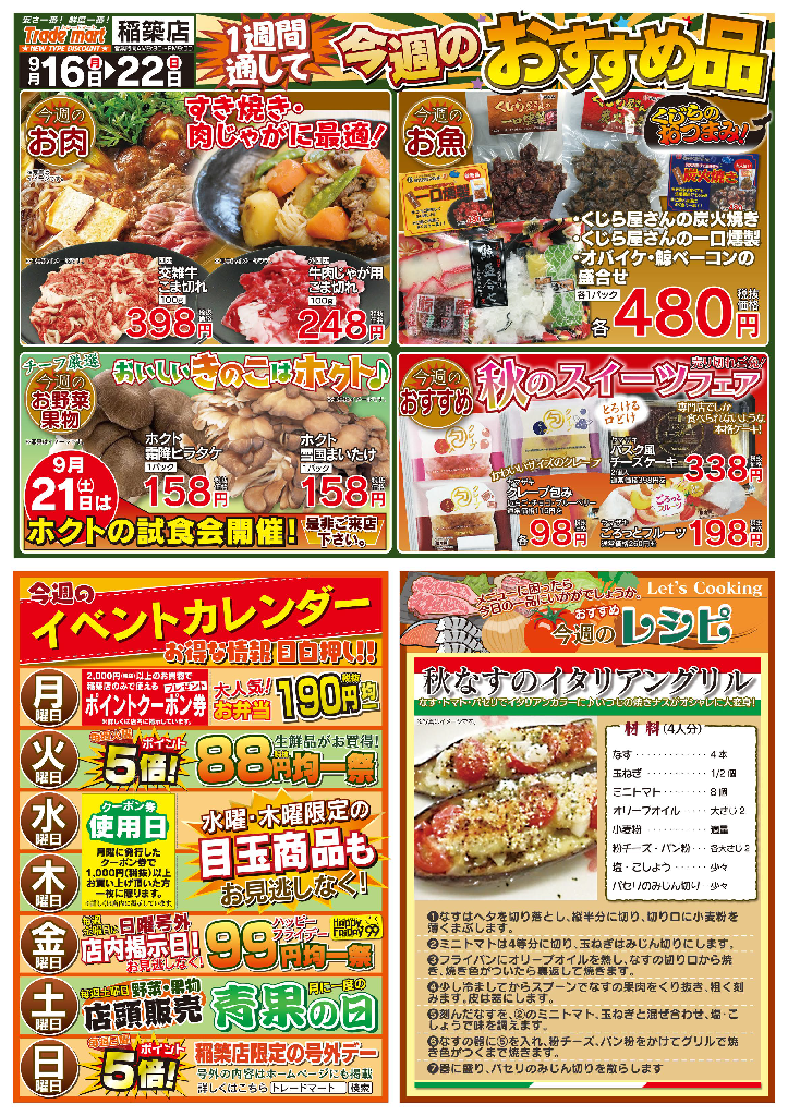 週間チラシには今週のイベントカレンダーやレシピなども掲載しています。