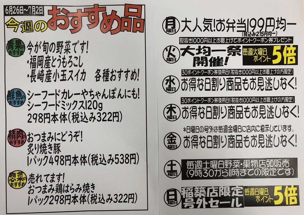 6/26(月)~7/2(日)稲築店の今週のおすすめ品のご紹介デス(*’ω’*)